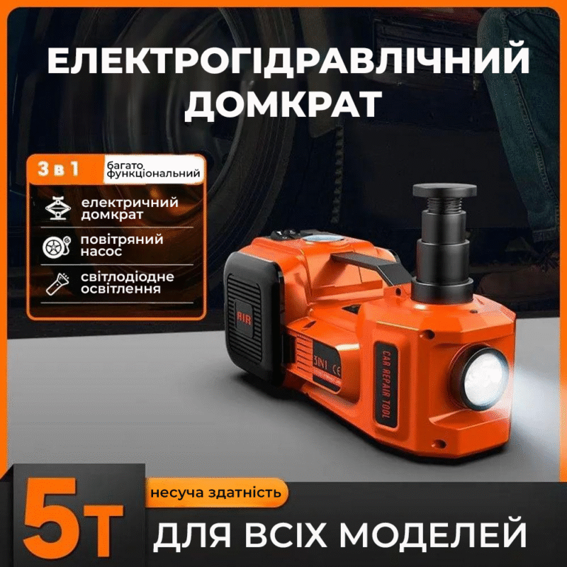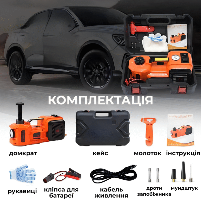Набір 3в1 електродомкрат 12V (до 3,5 т) + компресор + ліхтар (180 Вт)