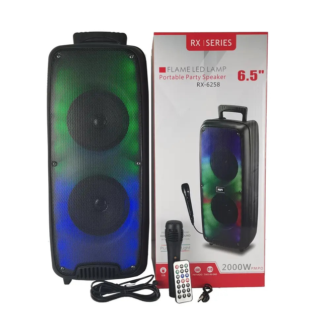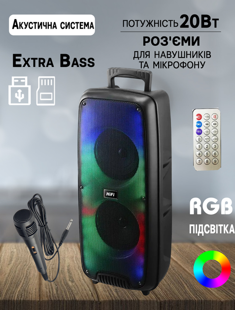 Портативна акустика з яскравим дизайном, якісним звуком та подвійними динаміками 6.5″ і 8″. Ідеально підходить для вечірок, тренувань, заходів або просто домашнього використання. Підтримує Bluetooth, USB, FM-радіо та має RGB-підсвітку.