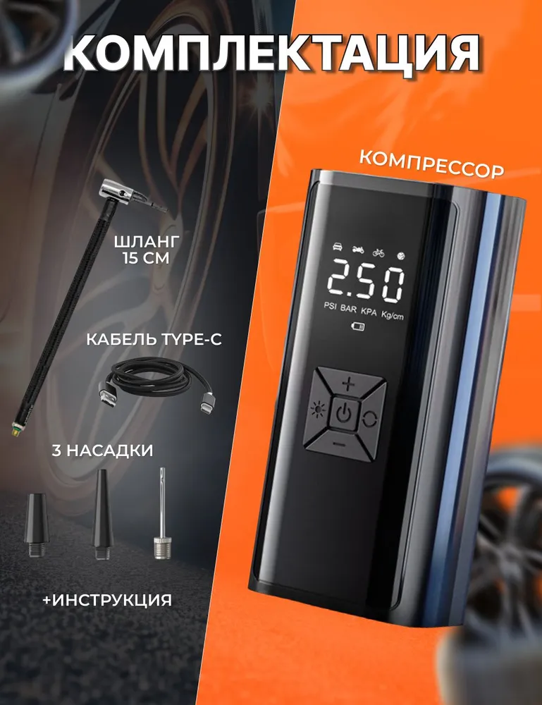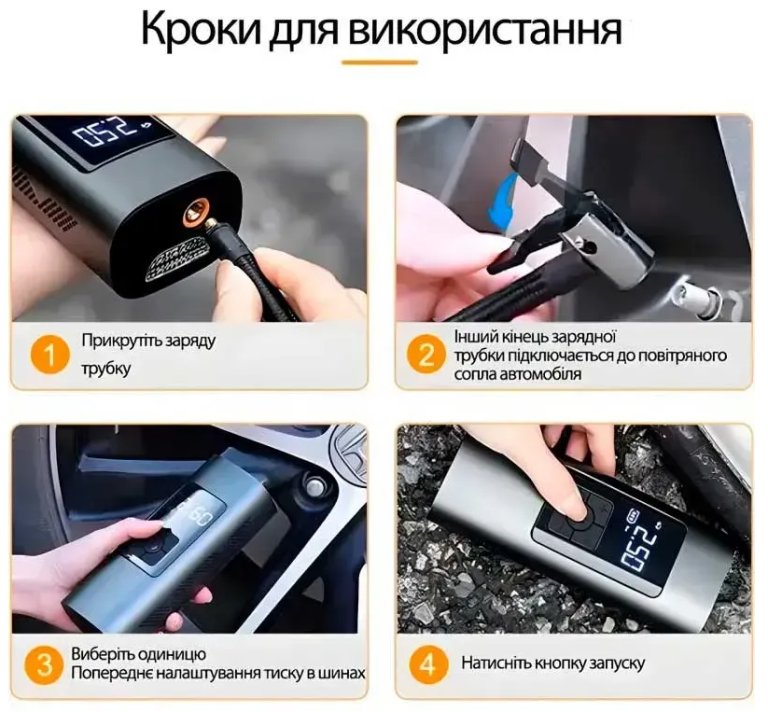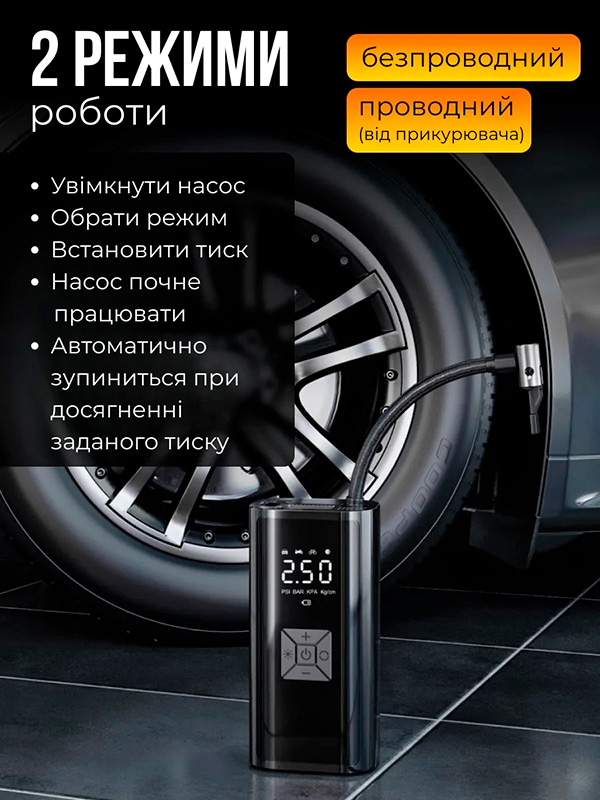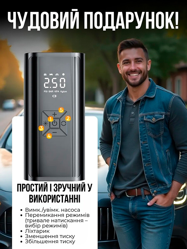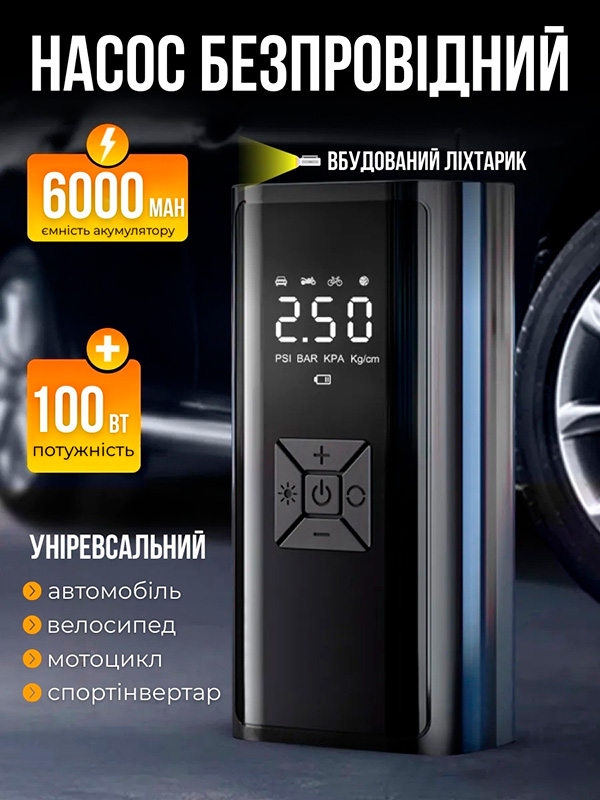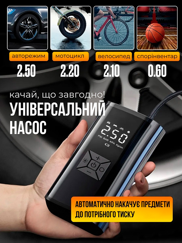 Працює швидко, надійний, перекачати не вийде, бо по досягненні виставленої величини тиску автоматично зупиняється. Універсальний, з допомогою насадок накачує велосипедні камери, мопеди, автомобільні камери, м’ячі спортивні. Компактний, легкий, зручний. Клас!!!