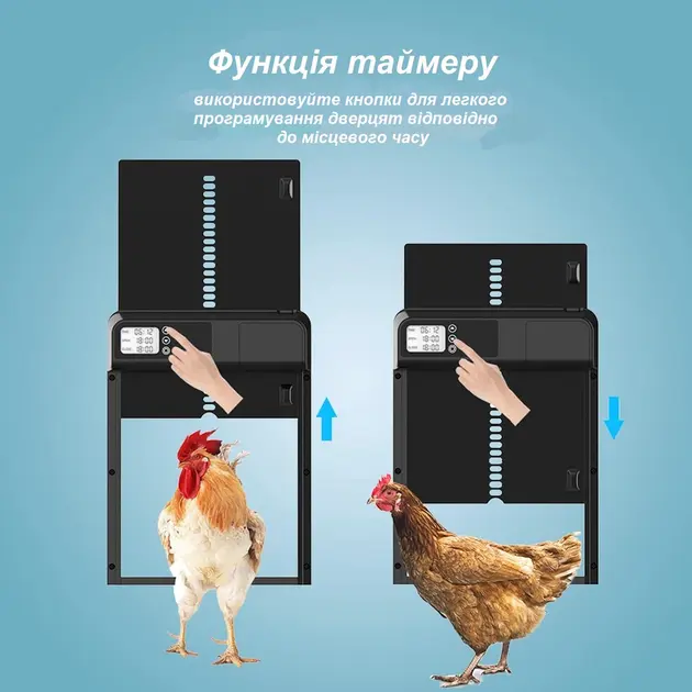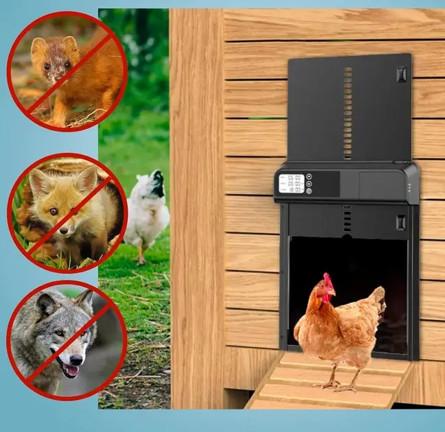 Ці автоматичні двері для курятника — ідеальне рішення для безпеки та комфорту вашої домашньої птиці. Завдяки вбудованому ЖК-дисплею, таймеру та сенсору освітлення, дверцята відкриваються і закриваються автоматично — у встановлений час або відповідно до сходу/заходу сонця.