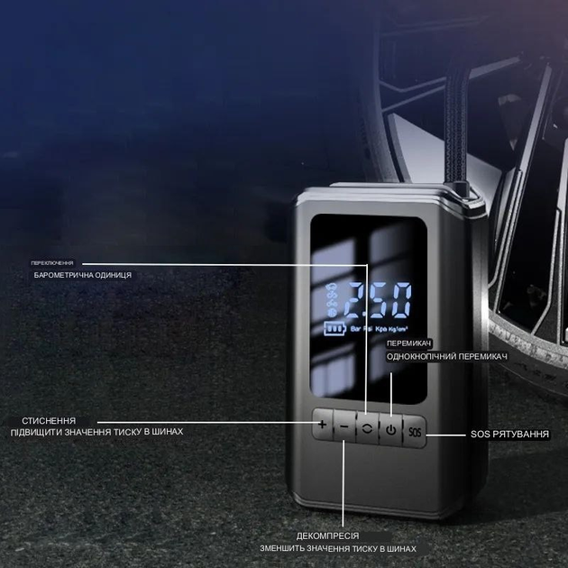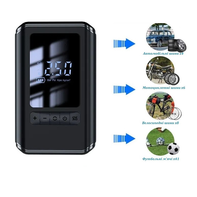 ФункціїКомпресор, повербанк, LED-ліхтарик (3 режими), живлення від прикурювача