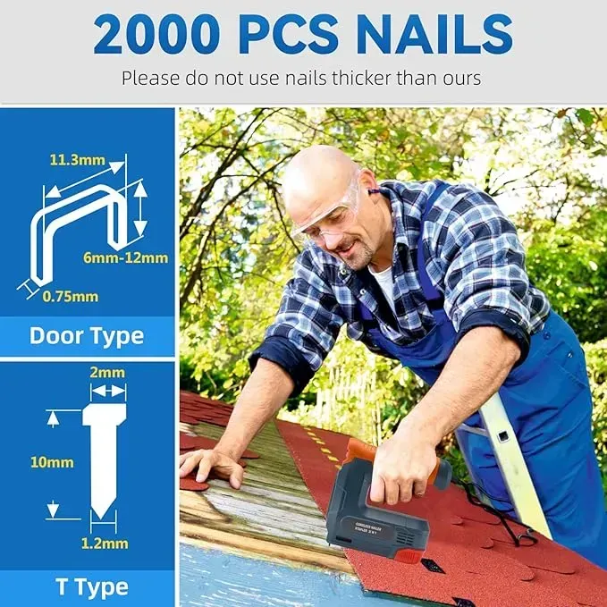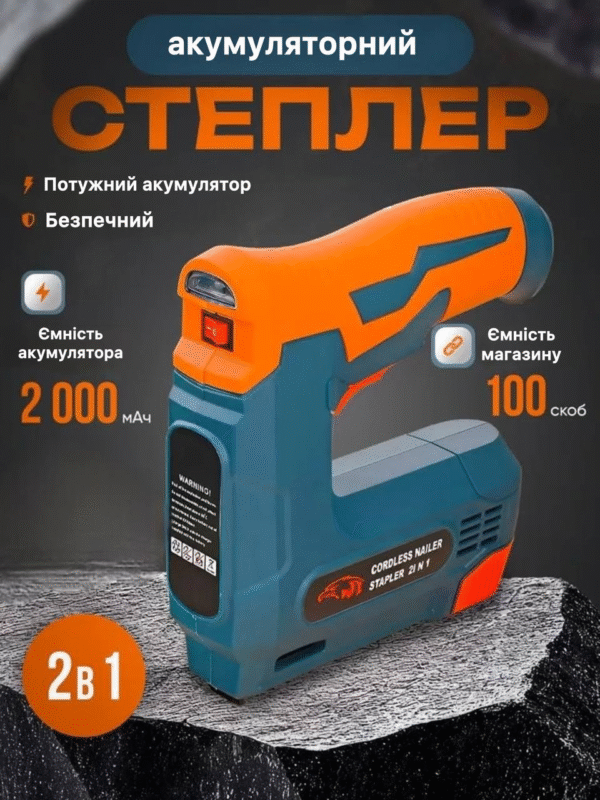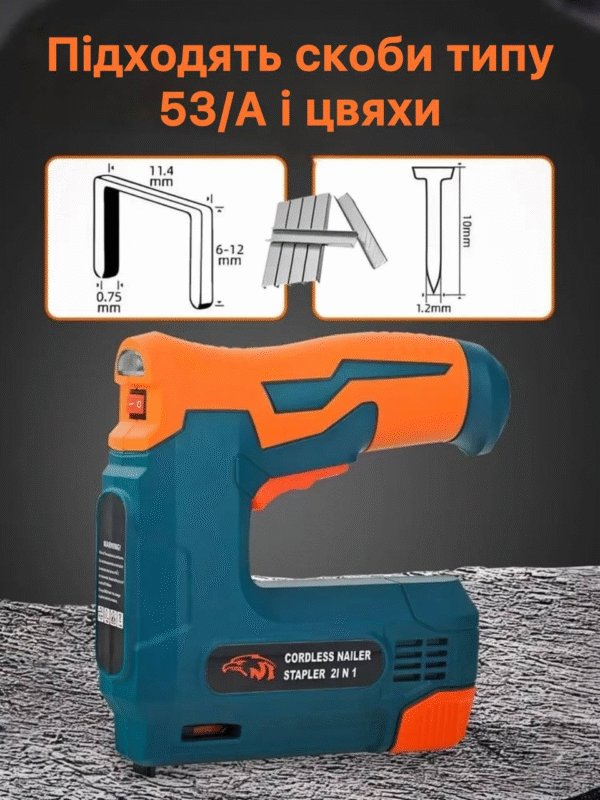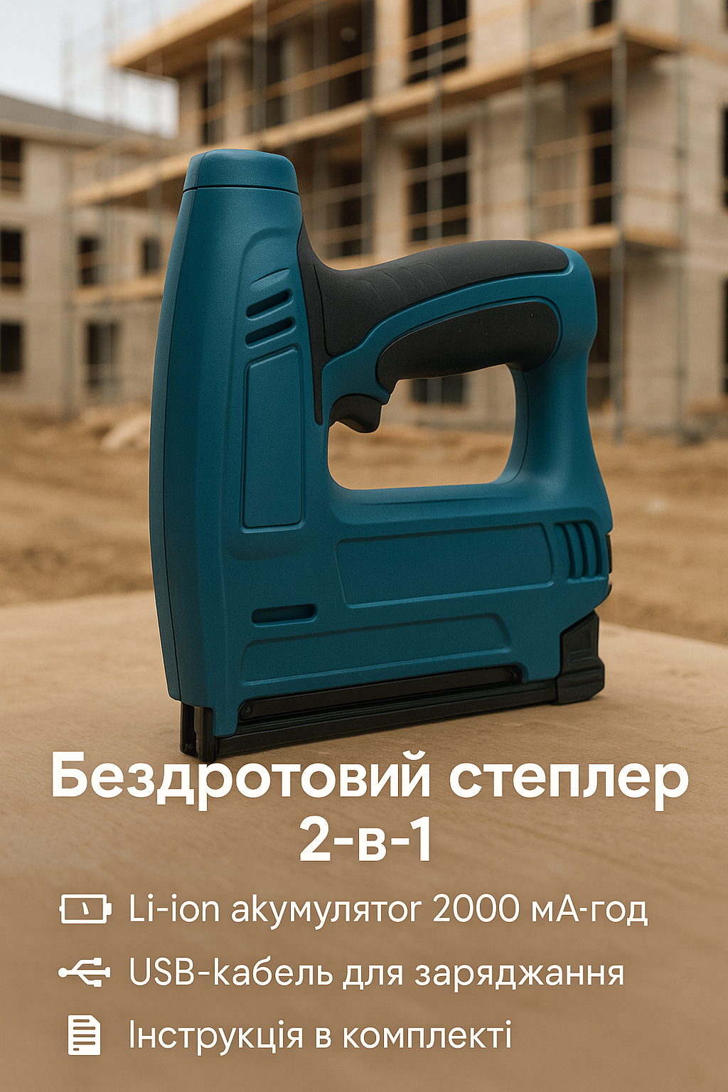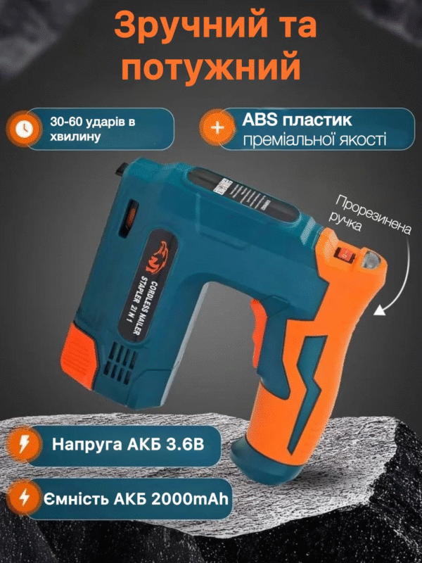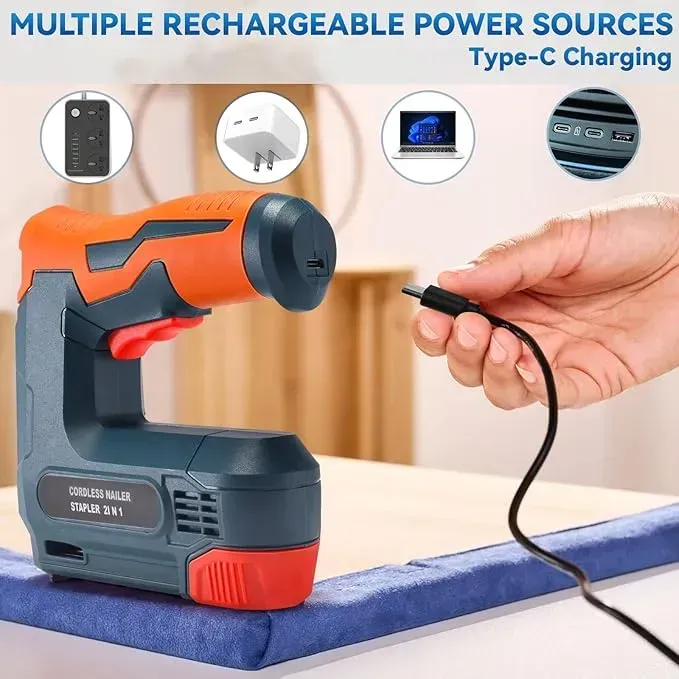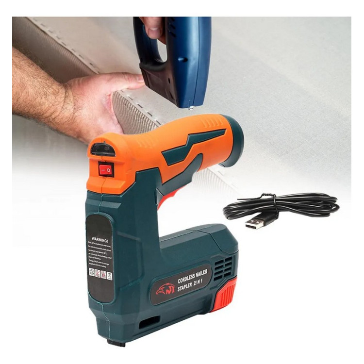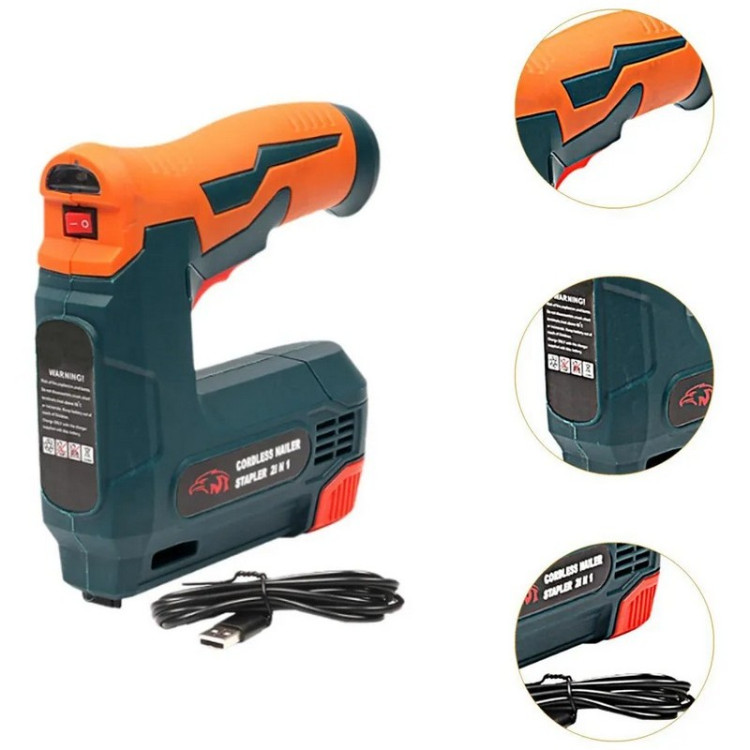 Бездротовий степлер живиться від літій-іонного акумулятора 2000 мА·год, який заряджається через USB-порт — швидко, просто та зручно навіть на виїздах. Має широкий спектр застосувань: меблеві роботи, обробка деревини, інтер’єрне оздоблення, будівельні задачі, DIY-проекти.