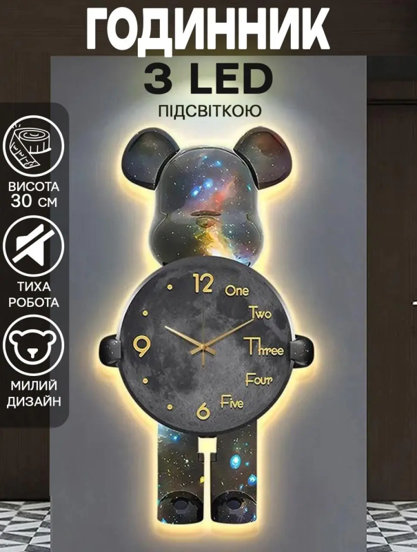 Годинник настінний DIY Bearbrick “Космічний ведмідь” з LED-підсвіткою 60×31 см