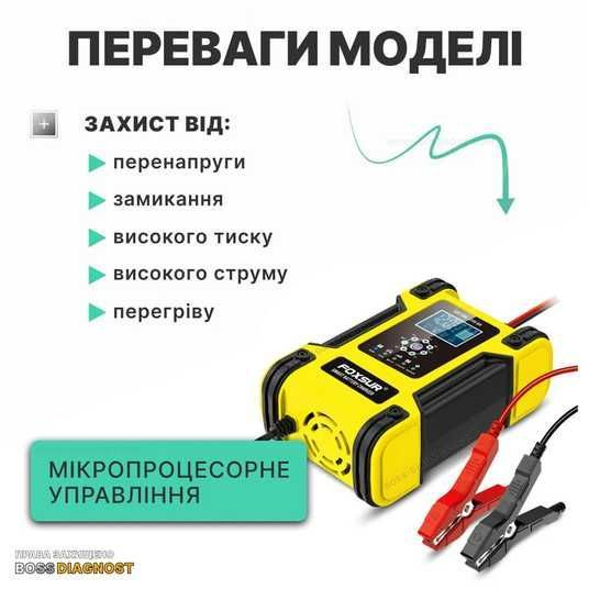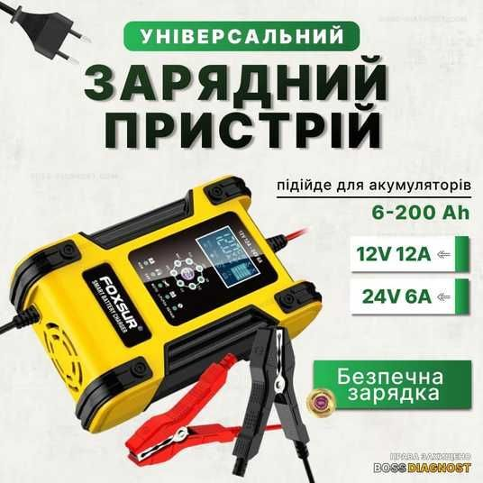 FOXSUR 12V/12А – 24V/6А — це універсальний мікропроцесорний зарядний пристрій з інтуїтивним LCD-дисплеєм, призначений для заряджання 12V або 24V акумуляторів ємністю до 150 А·год. Підходить для автомобілів, мотоциклів, вантажівок, човнів, газонокосарок тощо.