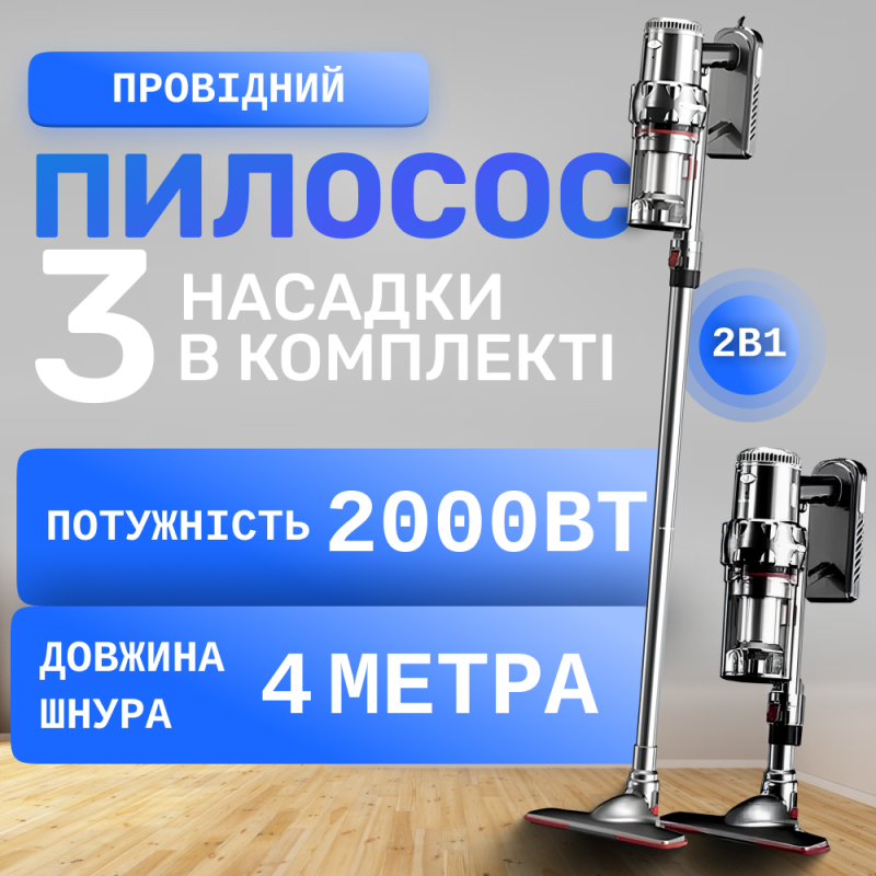 Сучасний вертикальний дротовий пилосос потужністю 2000 Вт, розроблений для ефективного сухого прибирання у вашому домі..