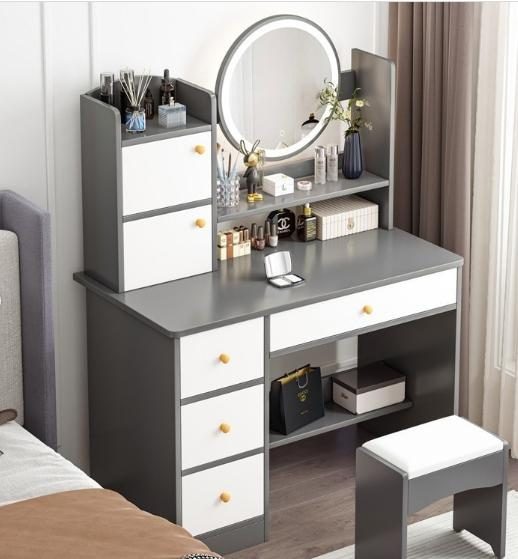 TT811 — сучасний і функціональний туалетний столик для макіяжу з великою дзеркальною панеллю, LED-підсвіткою, зручними шафками та полицями для зберігання косметики, прикрас і аксесуарів. Ідеально доповнить інтер’єр спальні або гардеробної.