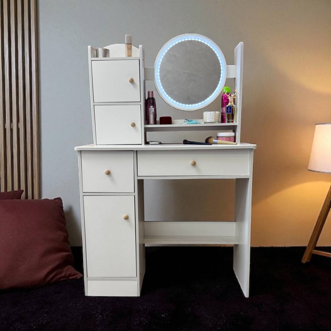 TT811 — сучасний і функціональний туалетний столик для макіяжу з великою дзеркальною панеллю, LED-підсвіткою, зручними шафками та полицями для зберігання косметики, прикрас і аксесуарів. Ідеально доповнить інтер’єр спальні або гардеробної.