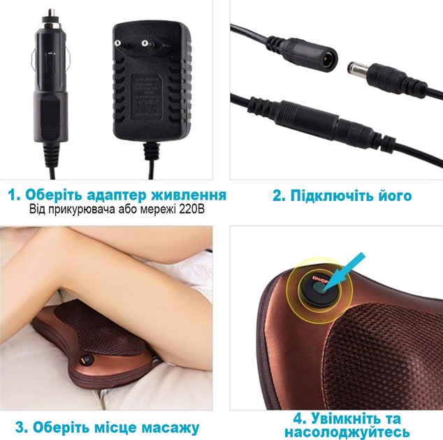 Масажні подушки – це особистий масажист будинку, в дорозі, в автомобілі, в офісі і на дачі. Масажна подушка універсальна тим, що з її допомогою можна робити роликовий масаж, що розминає, шиї і спини в автомобілі, а в домашніх умовах — масаж всього тіла від шиї до стоп. Невелика масажна подушка зручна у поїздках, її зручно покласти у валізу або на сидіння машини.