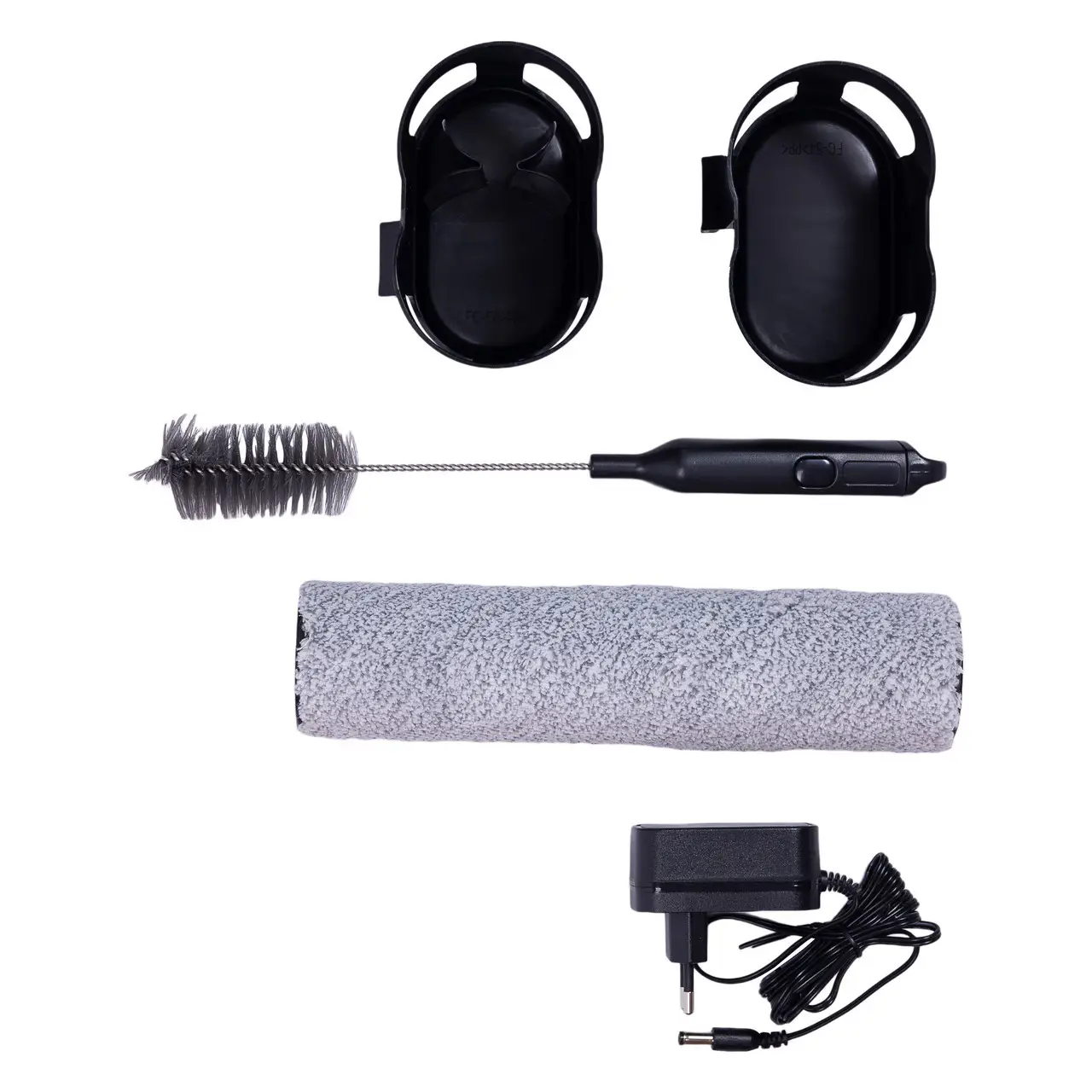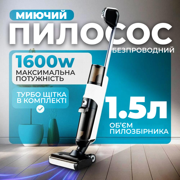 Акумулятор (вбудований) — ємність 2500 мА·год, до 25 хвилин автономної роботи Контейнер для чистої води — об’єм 500 мл для вологого прибирання Контейнер для збору бруду/рідини — знімний, легкий у догляді Зарядний адаптер — стандартний кабель для підключення до мережі Насадка для підлоги з щіткою — широка (27 см), з вологим скребком Інструмент для чищення фільтрів (за моделлю) Інструкція користувача українською або англійською Упаковка