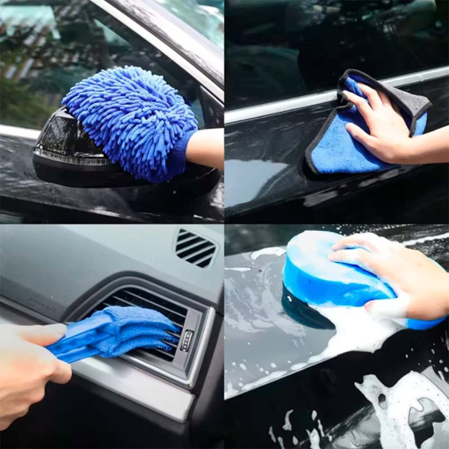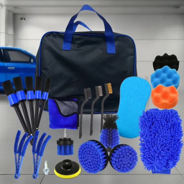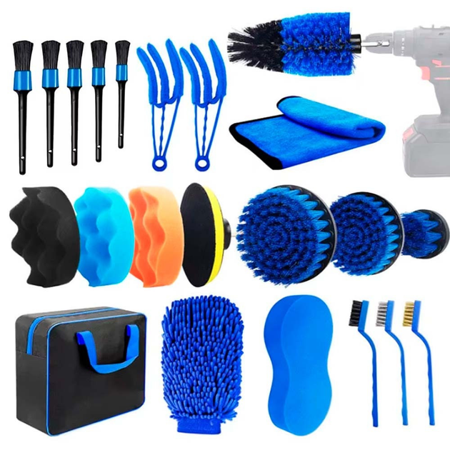 Набір CS-002 — це універсальний комплект з 20 предметів, який ідеально підходить для догляду за салоном і кузовом автомобіля. У ньому ви знайдете щітки, пензлі, мікрофібри, губки та інші інструменти, які дозволяють швидко та ефективно видалити пил, бруд, залишки поліролей або води після мийки.