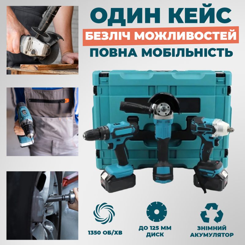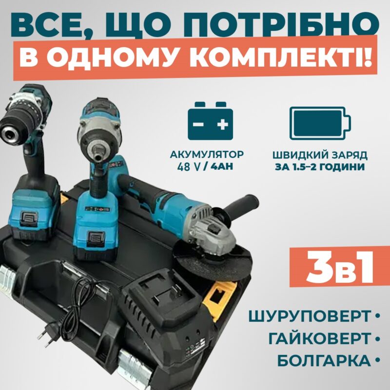 | Інструменти в комплекті | Шуруповерт, Болгарка, Гайковерт |