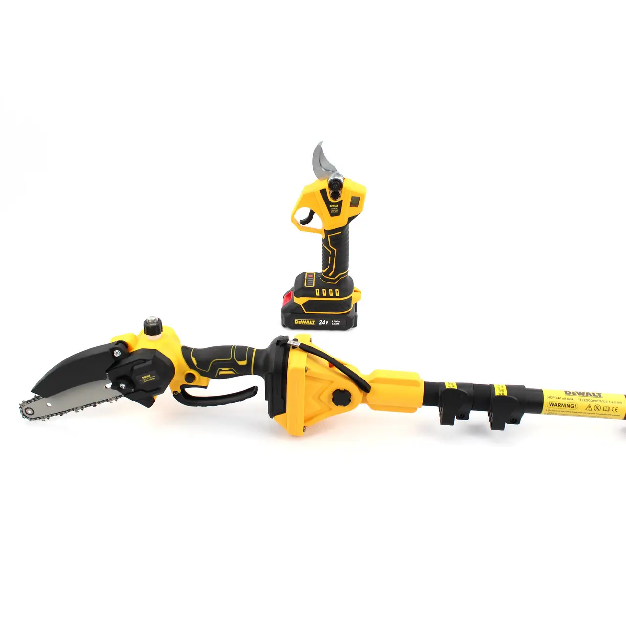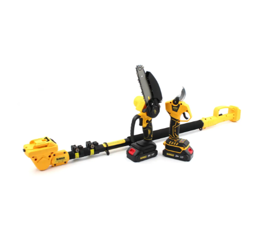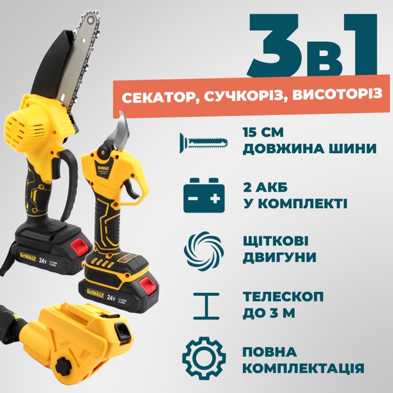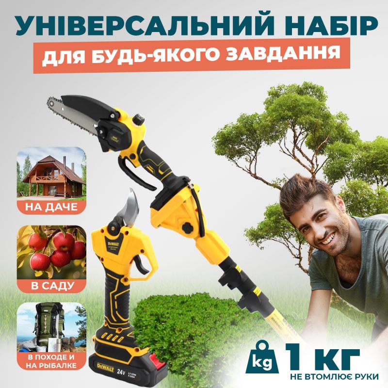 Професійний догляд за деревами, кущами та важкодоступними гілками ще ніколи не був таким простим. Багатофункціональний набір   об’єднує три надійні інструменти в одному кейсі: електросекатор, сучкоріз (міні-пила) та висоторіз із телескопічною штангою. Оснащений двома потужними акумуляторами 24Вт, цей комплект забезпечує мобільність, автономність і стабільну продуктивність на довгий час.
