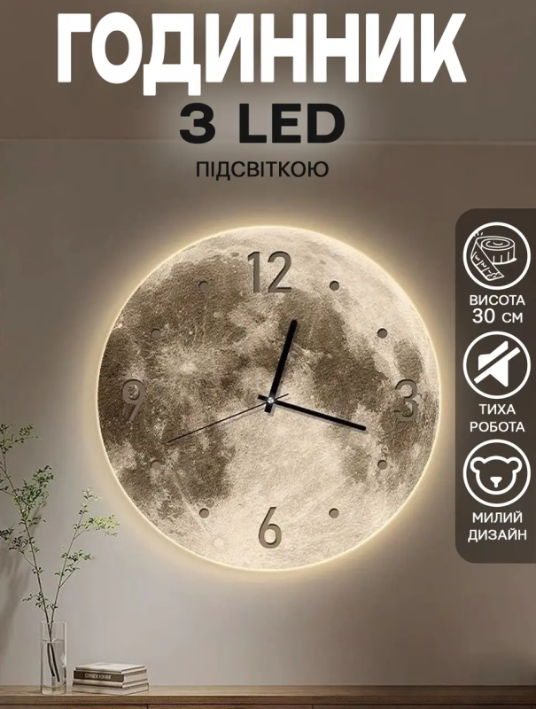 Стильний декоративний LED-годинник “Місяць” стане ідеальним доповненням інтер’єру вашої оселі, офісу або студії. Елегантне зображення поверхні місяця у поєднанні з арабськими цифрами, точками та плавною підсвіткою створює сучасний акцент на стіні.