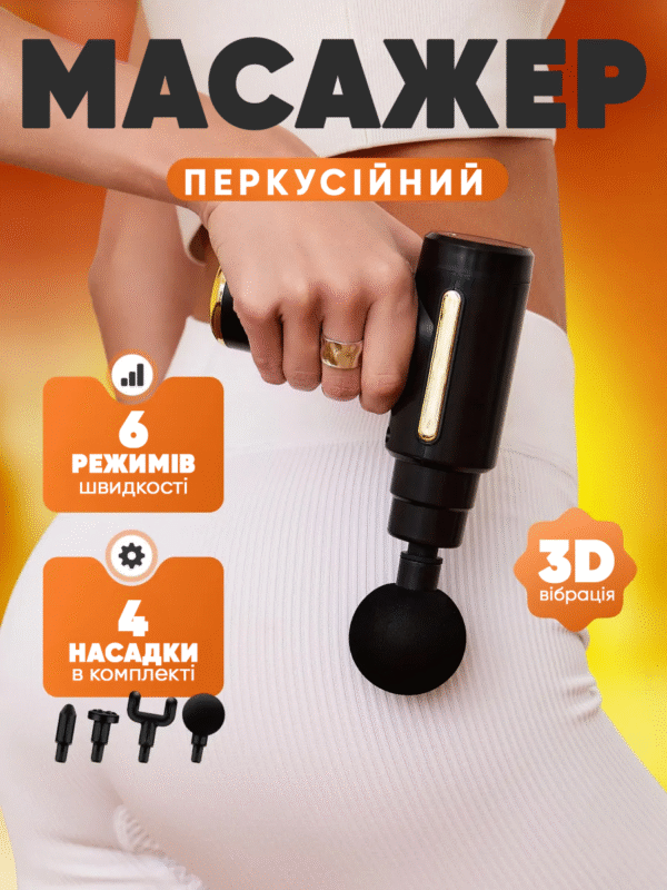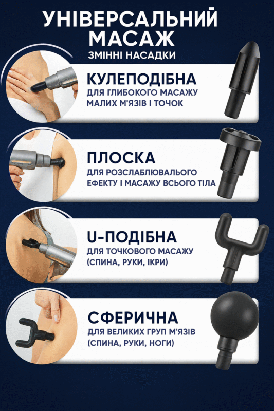 • 4 змінні насадки для різних груп м’язів — точковий, плоский, кульовий та U-подібний наконечники.