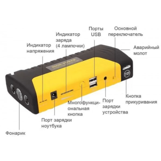 Акумулятор може зарядити найпопулярніші мобільні пристрої. Також, на випадок непередбачених обставин, Jump Starter забезпечений вбудованим ліхтариком із стробоскопом та спеціальним сигналом, молотком для розбиття скла автомобіля та стропорізом.