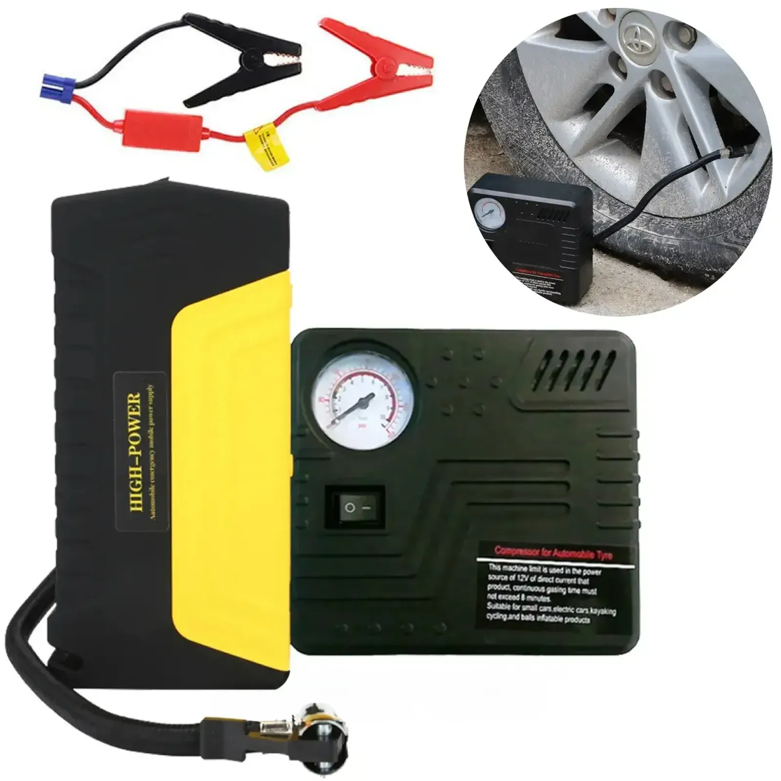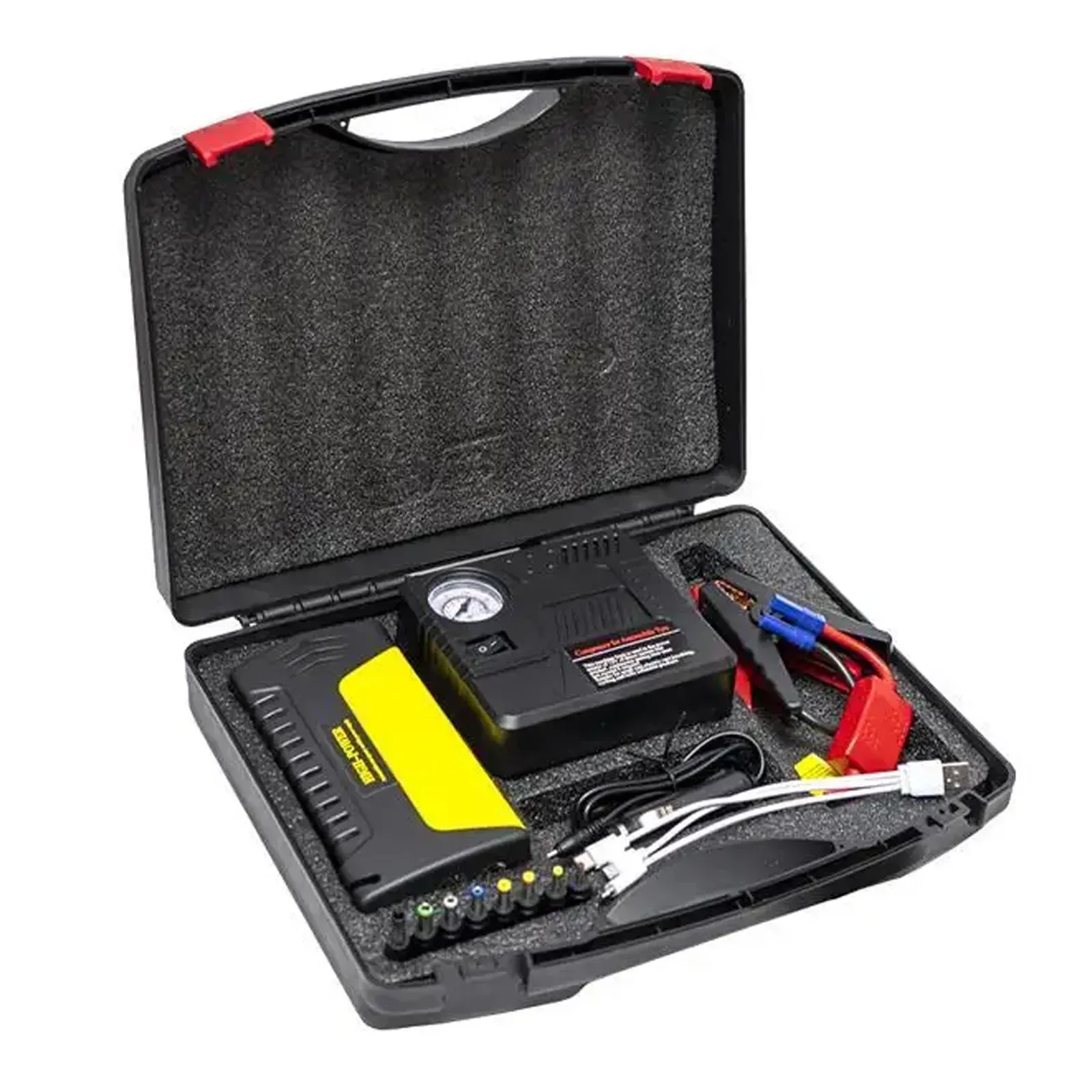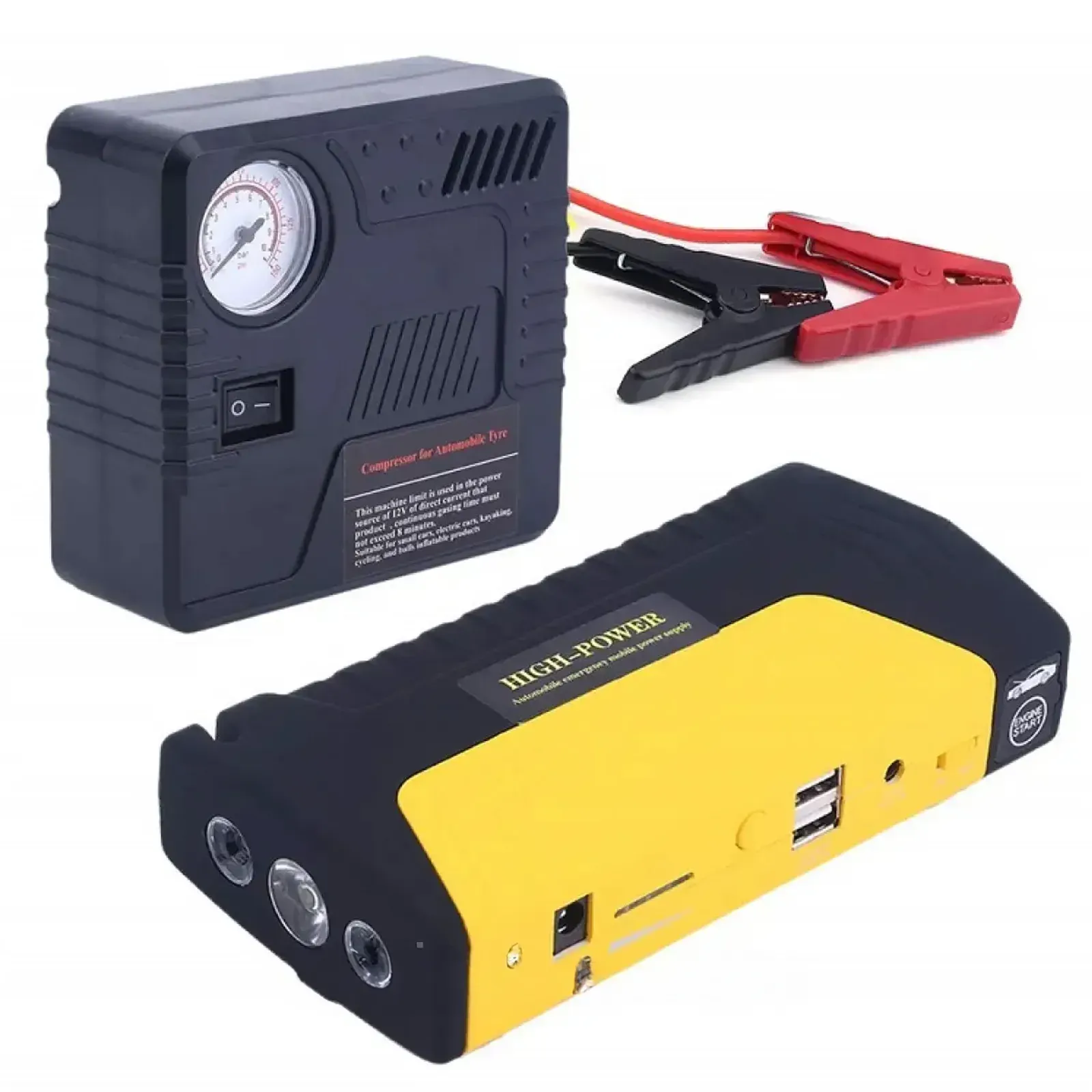 Забезпечує швидкий запуск двигуна з струмом 300 А (піковий до 600 А), працює від напруги 12 В і дозволяє зробити до 20 запусків без підзарядки. Компактний і легкий (0,5 кг), оснащений шлангом довжиною 0,5 м для накачування шин з максимальним тиском 150 PSI.