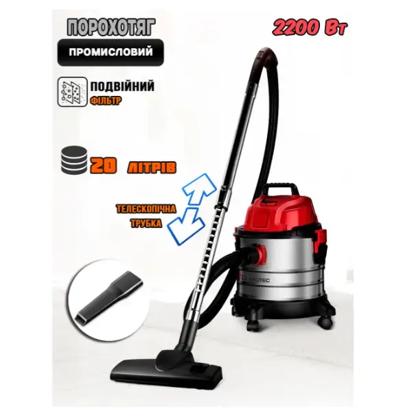 DOMOTEC MS-4411 — це універсальний будівельний та побутовий пилосос 4 в 1, який здатен усе: сухе й вологе прибирання, збір рідини, функція видування. Він поєднує високу потужність 2200 Вт, місткий бак на 20 літрів і набір насадок для будь-яких задач.