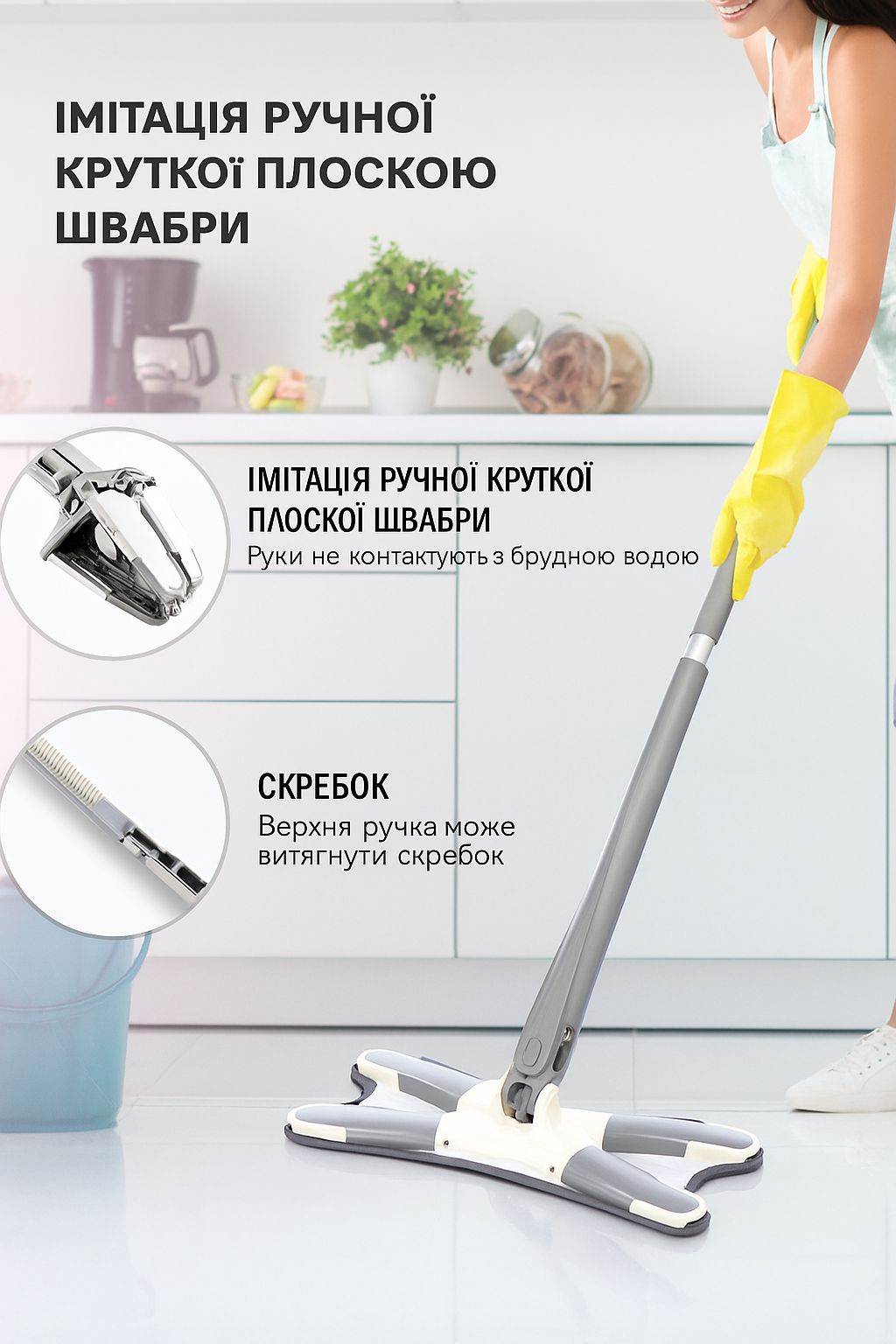 Інноваційна система дозволяє швидко віджимати швабру без дотику до води.