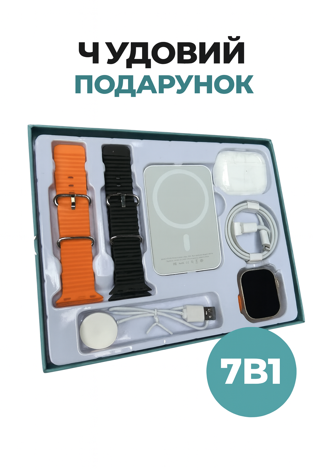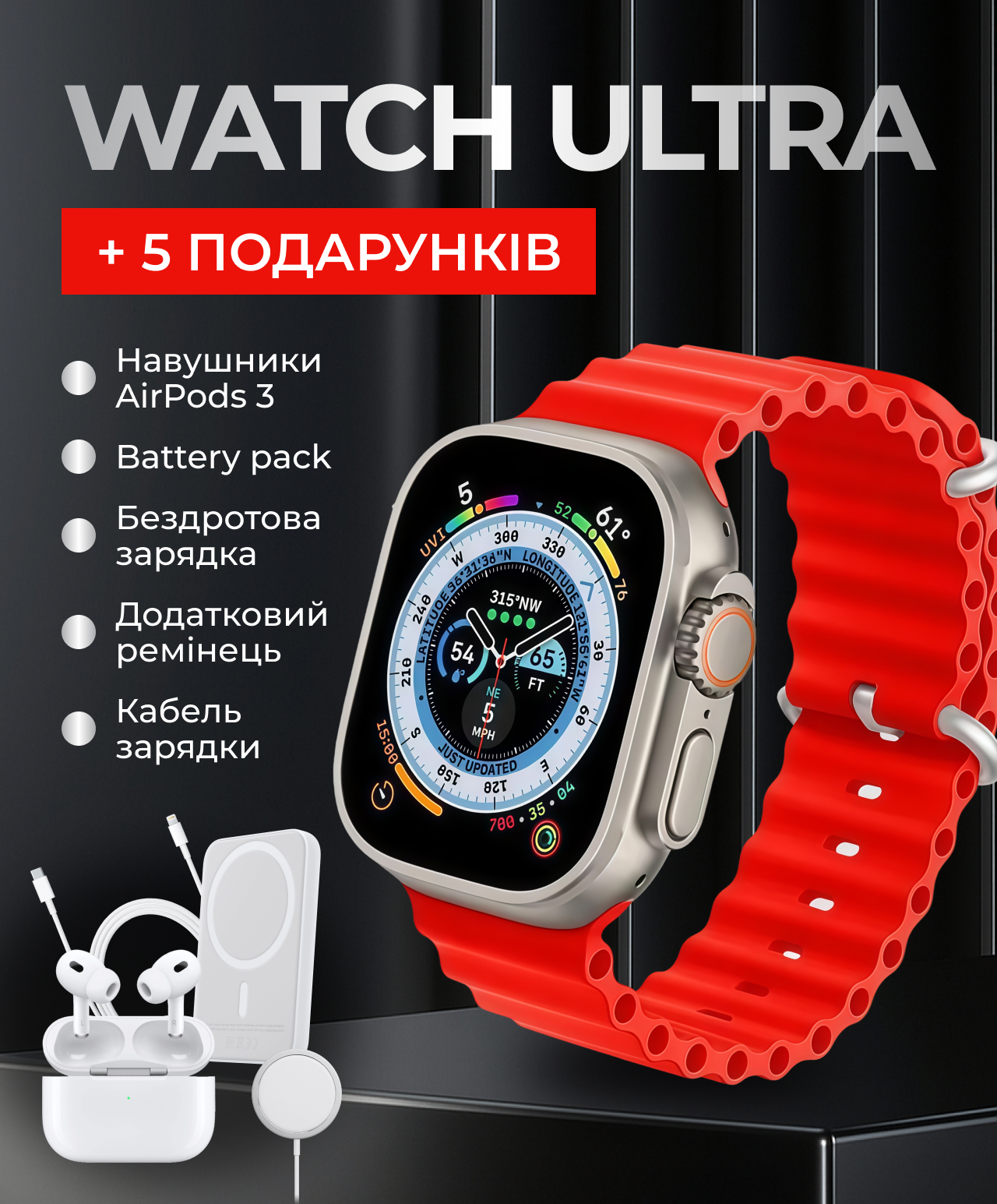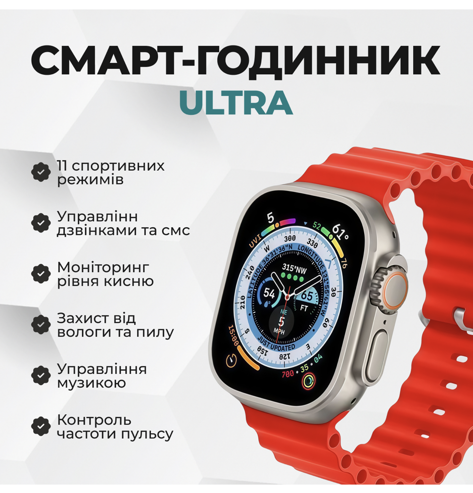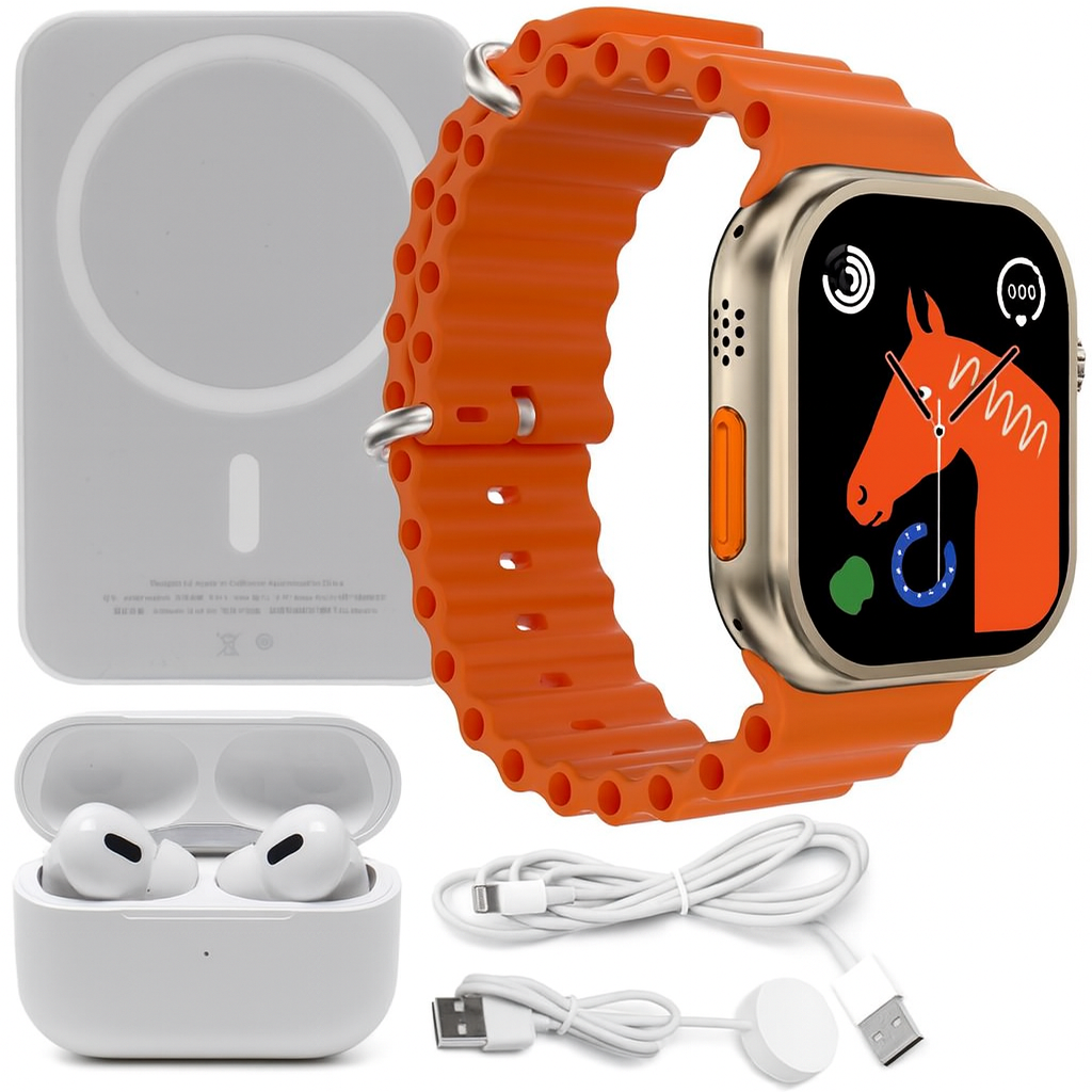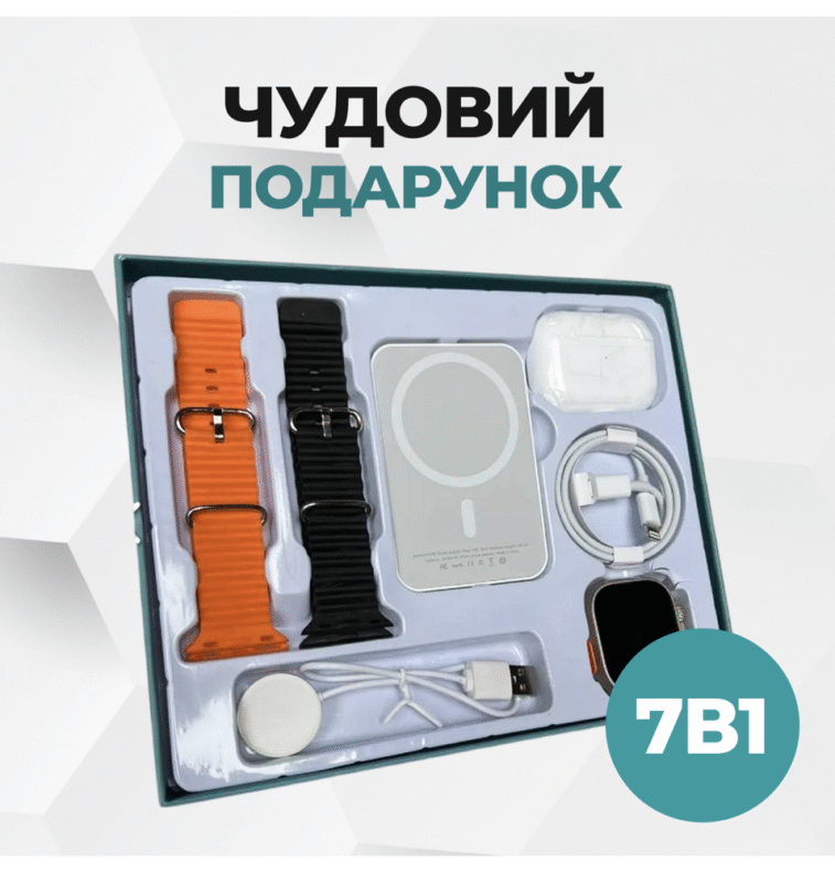 Смарт-годинник Watch Ultra створений для активних людей: точні датчики, Bluetooth-дзвінки, моніторинг сну, пульсу та тиску. Міцний корпус та яскравий екран гарантують комфорт у будь-яких умовах. Разом із годинником ви отримуєте набір подарунків для повного користування — від навушників до бездротової зарядки.